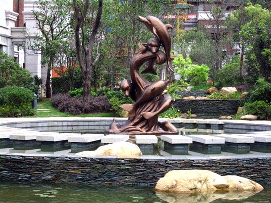 景觀小品是景觀中的點(diǎn)睛之筆,一些造型優(yōu)美的藝術(shù)小品,更是讓空間環(huán)境生動(dòng)起來(lái)的關(guān)鍵因素。在保利·拉菲,帶有濃郁意大利氣息以及中西文化合璧的景觀小品隨處可見(jiàn)。入口處的歐式水景幕墻利用中國(guó)黑、黃銹石燒面、砂巖雕花巧妙結(jié)合,形成一幅精美的藝術(shù)畫(huà)面,幕墻中不斷噴涌的水流激起陣陣白色的漣漪,將后面寫(xiě)有“保利·拉菲”字跡的景墻襯托得清爽大氣,在陽(yáng)光照耀下,呈現(xiàn)出流暢、動(dòng)感的畫(huà)面。特別引人注目的是模仿圓明園四大獸首制作的水景雕塑,牛首、豬首、猴首、虎首這四大獸首,形象上采取了西方動(dòng)物的特征,融合了中國(guó)的傳統(tǒng)文化與西方的特色魅力,當(dāng)細(xì)長(zhǎng)的水流從四大獸首的口中源源不斷地吐出、落入前方的水池里時(shí),就與從下而上噴出的涌泉形成互動(dòng),一上一下、一細(xì)一粗,前方再配以色彩絢麗的花草,形成一處動(dòng)靜相宜、格調(diào)清新的水景。