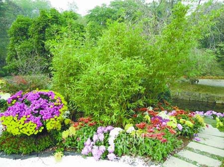 《綠廬》面積只有約400平方米,但植物配置極為豐富,在充分利用原有的桂花、櫻花、羅漢松、竹子等植物的基礎(chǔ)上,又加入了彩葉冬青、厚皮香、銀霜女貞、紅葉扶桑、龜甲冬青、紅花檵木、美人蕉、蘭花三七、沿階草、金邊胡頹子等幾十種植物與菊花相配置,形成了色彩絢麗、層次飽滿、清新雅致的庭院景觀?!斑@次應(yīng)用的菊花品種有二、三十種,主要有綠牡丹、春日見(jiàn)山、金龍騰云、白萬(wàn)勝、紅切花、紅衣錦繡……顏色有紅、綠、粉、紫、黃等,通過(guò)不同的配植手法,營(yíng)造出五彩斑斕、生機(jī)無(wú)限、高潔清雅的美景,讓人絲毫感覺(jué)不到秋之凋零,反而像是暢游春之繁花勝景?!痹撠?fù)責(zé)人笑著說(shuō)。