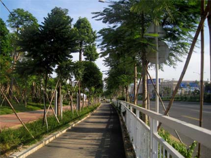 眼前的這條道路開闊大氣、綠色生態(tài),而當(dāng)初施工時(shí),卻面臨著很多難題。該項(xiàng)目定位較高,工期短,交叉施工嚴(yán)重,更經(jīng)歷了濱海的臺(tái)風(fēng)季節(jié)天氣,所以施工中對(duì)施工工序組織、材料組織及機(jī)械勞動(dòng)力的組織顯得尤為重要;由于施工范圍處于交通繁忙的205國道深圳段,對(duì)施工現(xiàn)場車輛的疏導(dǎo)及路邊作業(yè)的圍護(hù)等的要求都需嚴(yán)格把控;為了保證景觀效果,對(duì)苗木的要求比較高,很多假植的苗木需要用保鮮的方法長途運(yùn)載到施工現(xiàn)場進(jìn)行種植?!笆┕ぶ忻媾R的各種不利因素不但增加了工程成本,更加大了施工難度,但在項(xiàng)目部全體人員工的共同努力下,最終克服種種困難,圓滿完成了任務(wù),展現(xiàn)了杭州市園林綠化工程有限公司優(yōu)質(zhì)高效、創(chuàng)新進(jìn)取的企業(yè)形象,受到各方的一致好評(píng)?!毙煜蛎鞯囊环喍淘捳Z,卻讓我們感受到了施工期間的諸多辛苦。