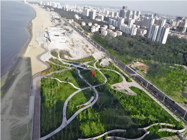 為此,在植物配置上,以鄉(xiāng)土樹種為基調(diào),上層空間以銀杏、白蠟、槐樹、黑松、二球懸鈴木為主,中層空間主要選用黑松、花石榴、紫葉李、垂柳、山楂,下層空間多用瓜子黃楊、大葉黃楊、紫葉小檗、紅葉石楠、連翹、海桐,搭配夏瑾、孔雀草、矮牽牛等鮮艷的草花點綴,起畫龍點睛作用。同時,在展館周邊搭配高大喬木白蠟、二球懸鈴木、銀杏等,與展館相輔相成,相互呼應。為營造出開闊的空間感,工程中采用大面積草坪鋪裝。草坪用草以百慕大為主,具有抗旱、抗踩等特點,適合海邊種植。