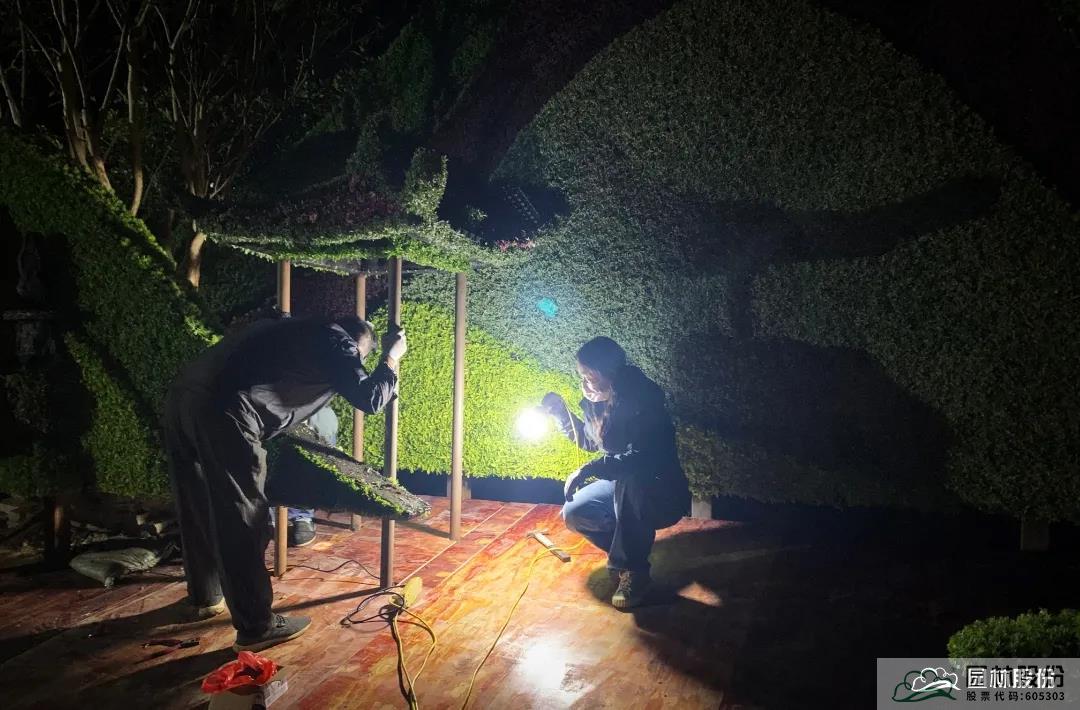 為不影響施工進度,對綠雕局部拆卸后移至指定位置,并按要求二次拼裝。而拼裝后的綠雕,部分作業(yè)面變窄,給插草工作帶來了較大不便。