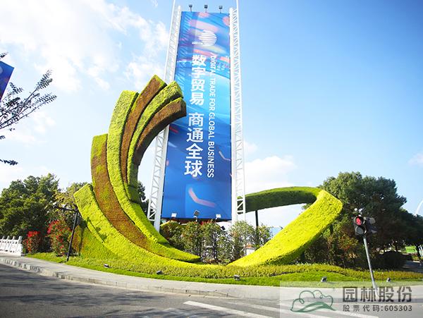 為增加數貿展會主題在邊側帶內設置3座綠雕:杭扇-以扇子造型主題的全球數字貿易博覽會綠雕,展-以全球數字貿易博覽會會徽造型綠雕,數貿-以飄帶造型主題的“數貿錢潮 杭向未來”綠雕。綠雕植物均采用佛甲草和五色草搭配,周邊采用三角梅及花鏡植物配置。港南大道島頭花鏡運用金姬錐、彩葉球、細葉芒、塞娜等植物來強化迎賓氣氛,通過多年生地被草花,結合精致植物組團+特色綠雕,共同營造多彩氛圍,打造熱烈迎賓門戶。